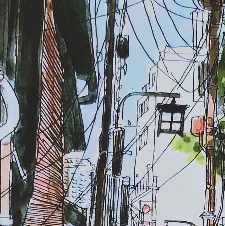 日差しが降りそそぐ街並みの様子を描いています。