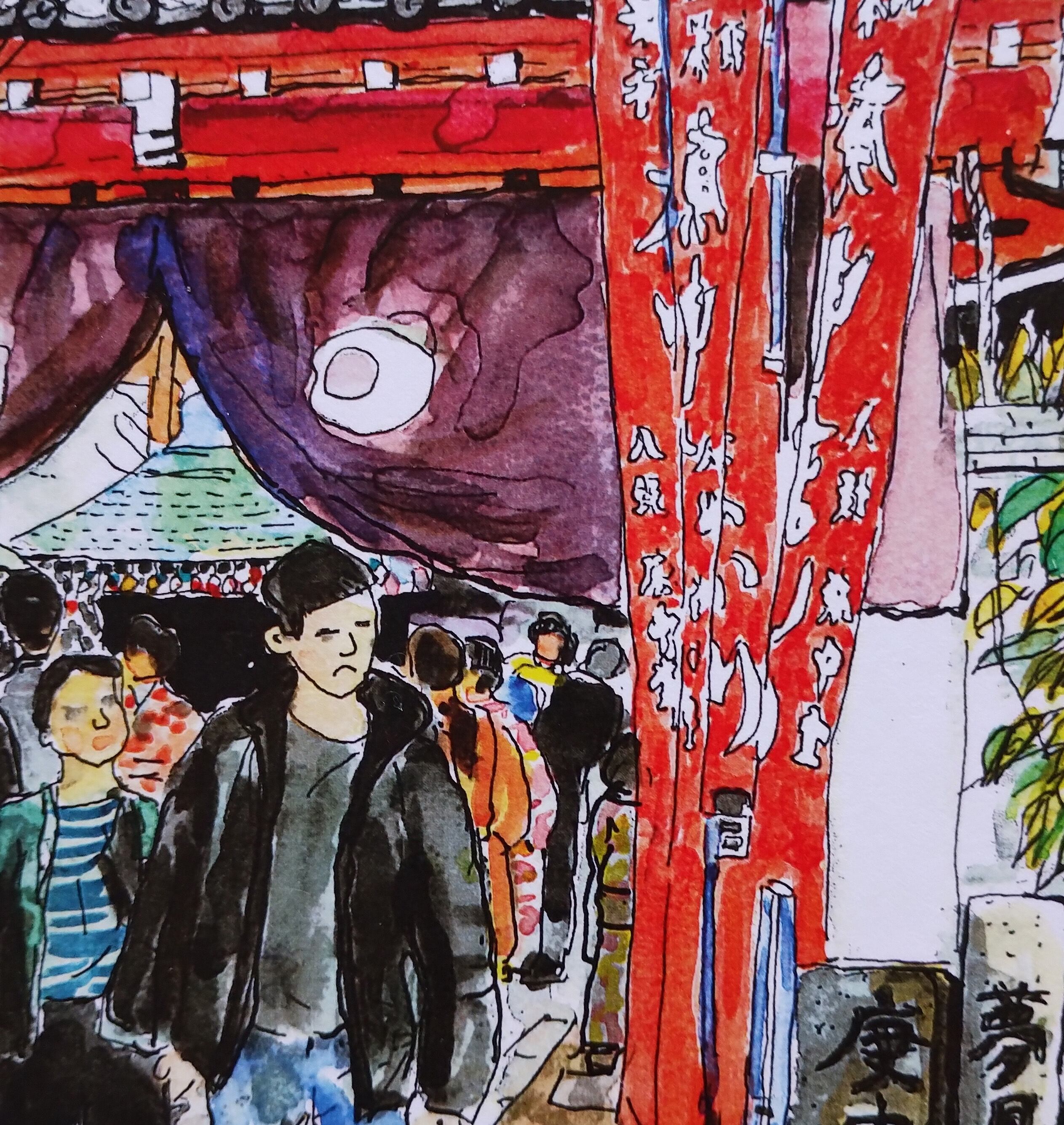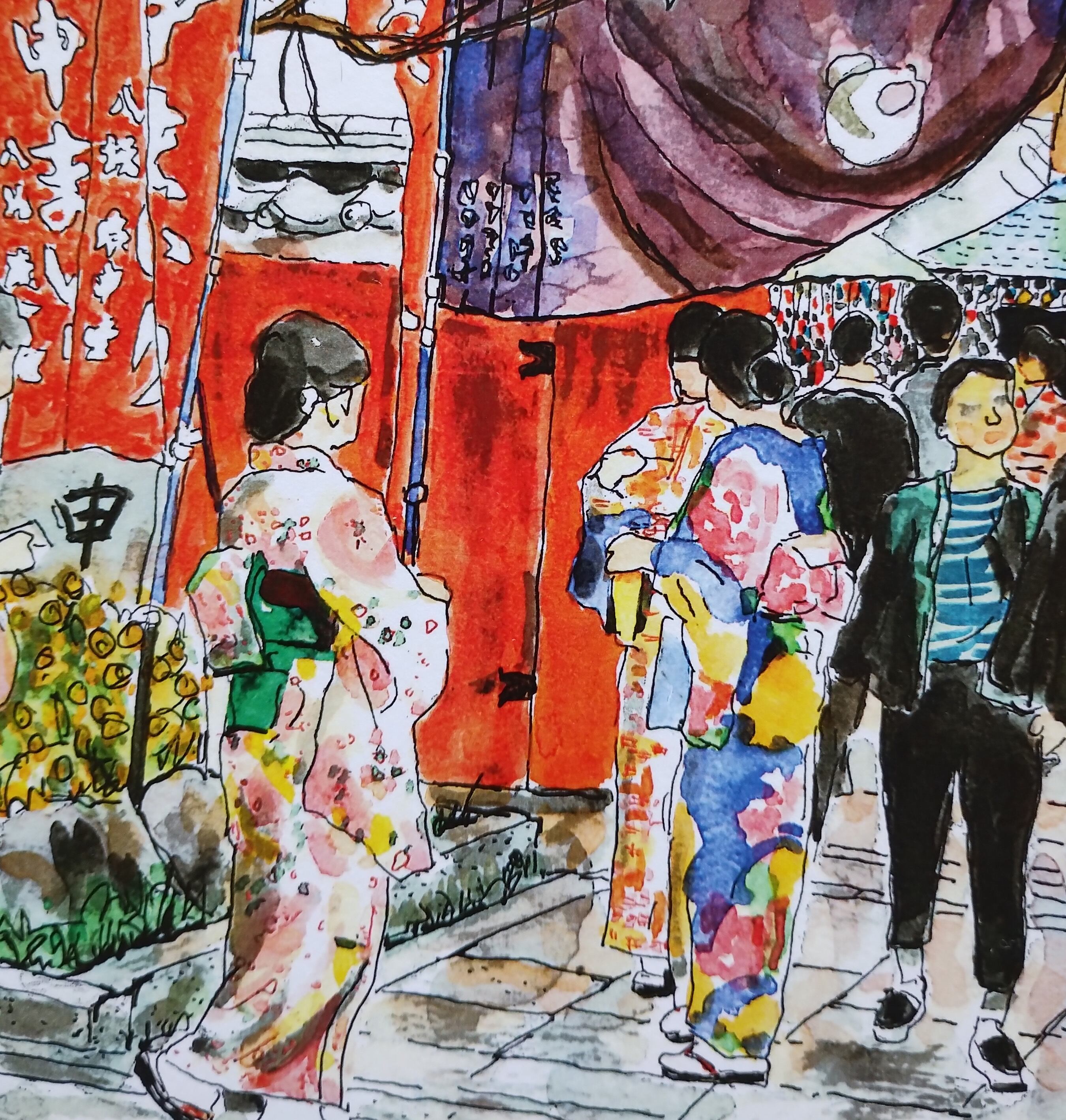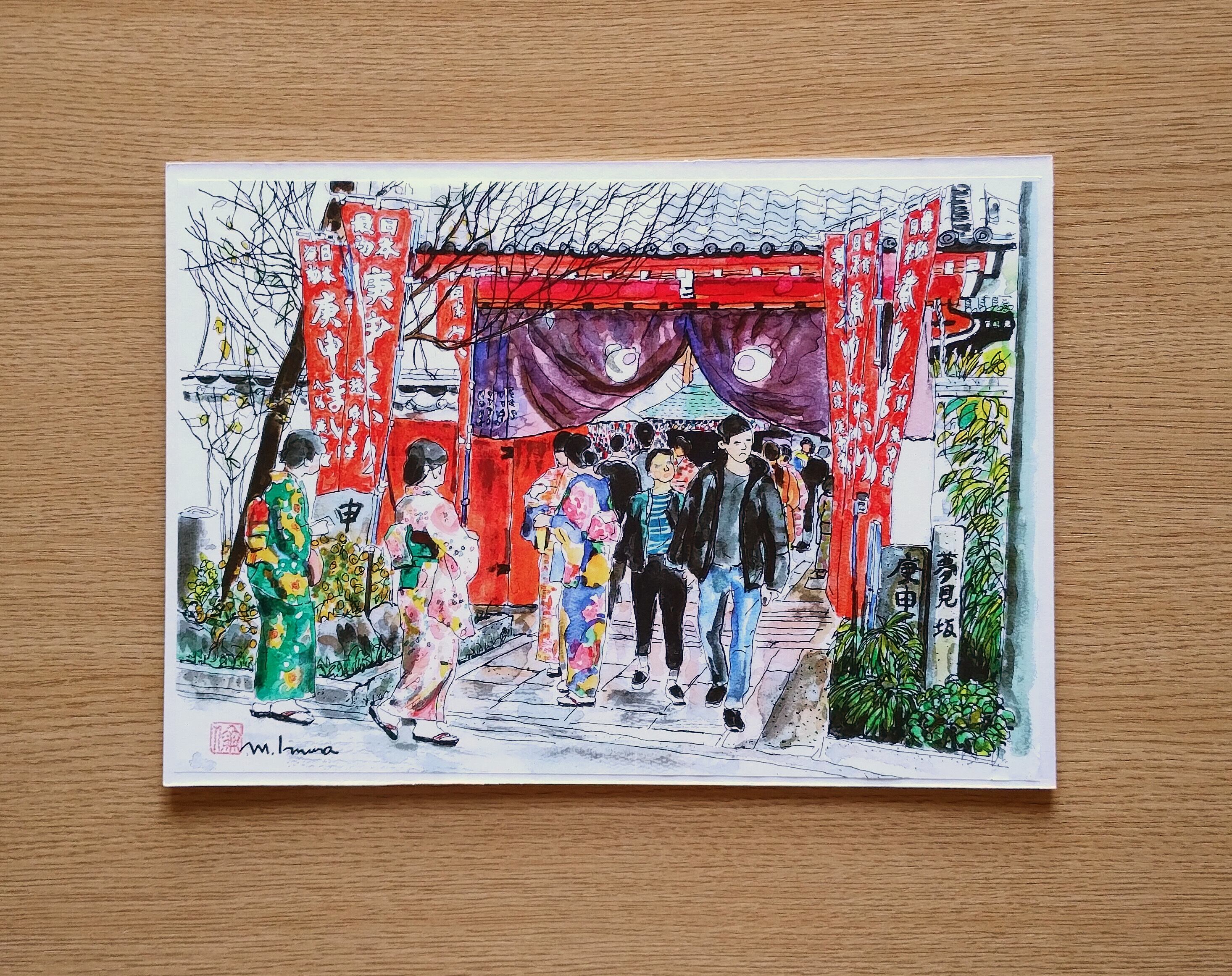 原画はペンで線描き後、透明水彩絵具で着色しています。
