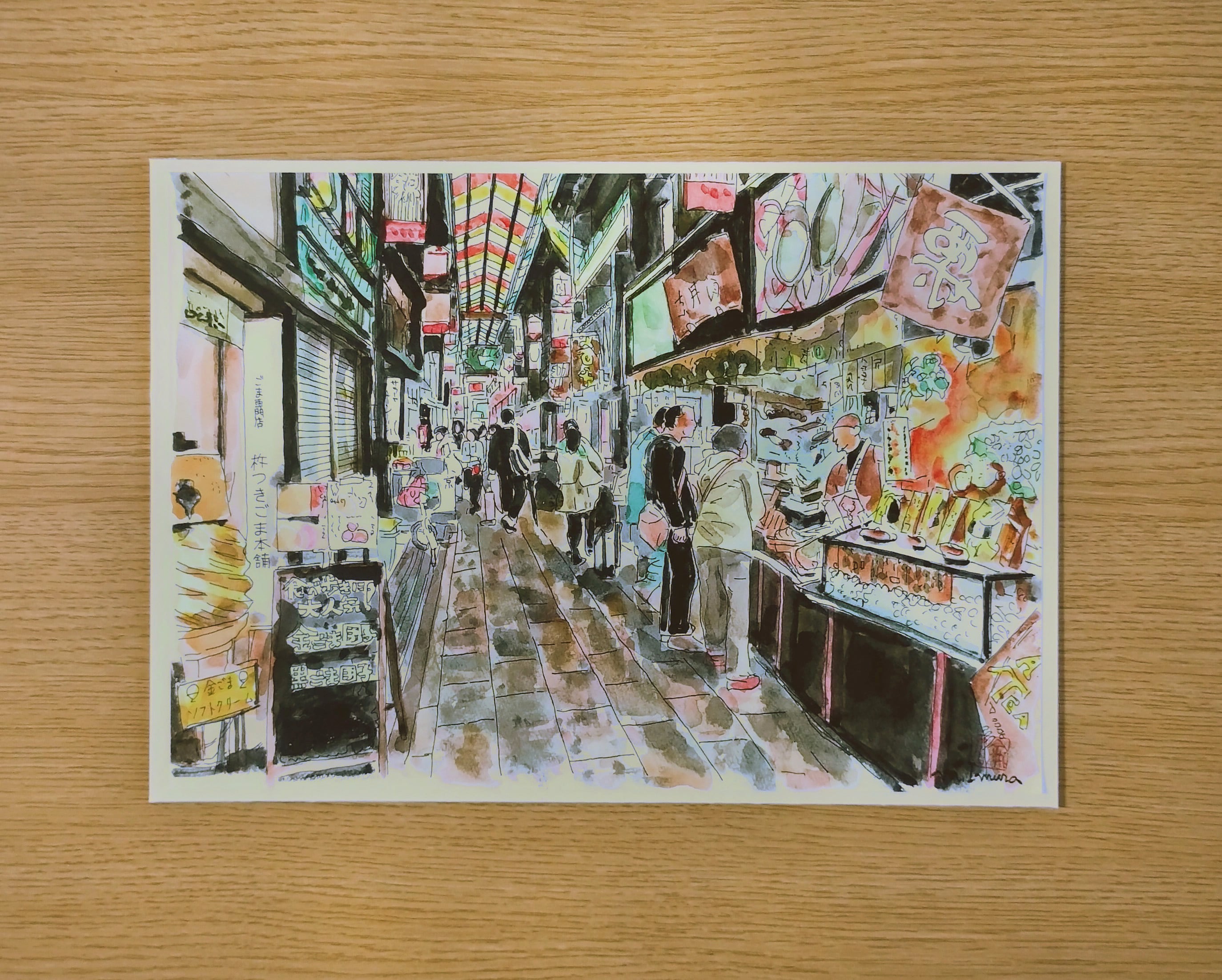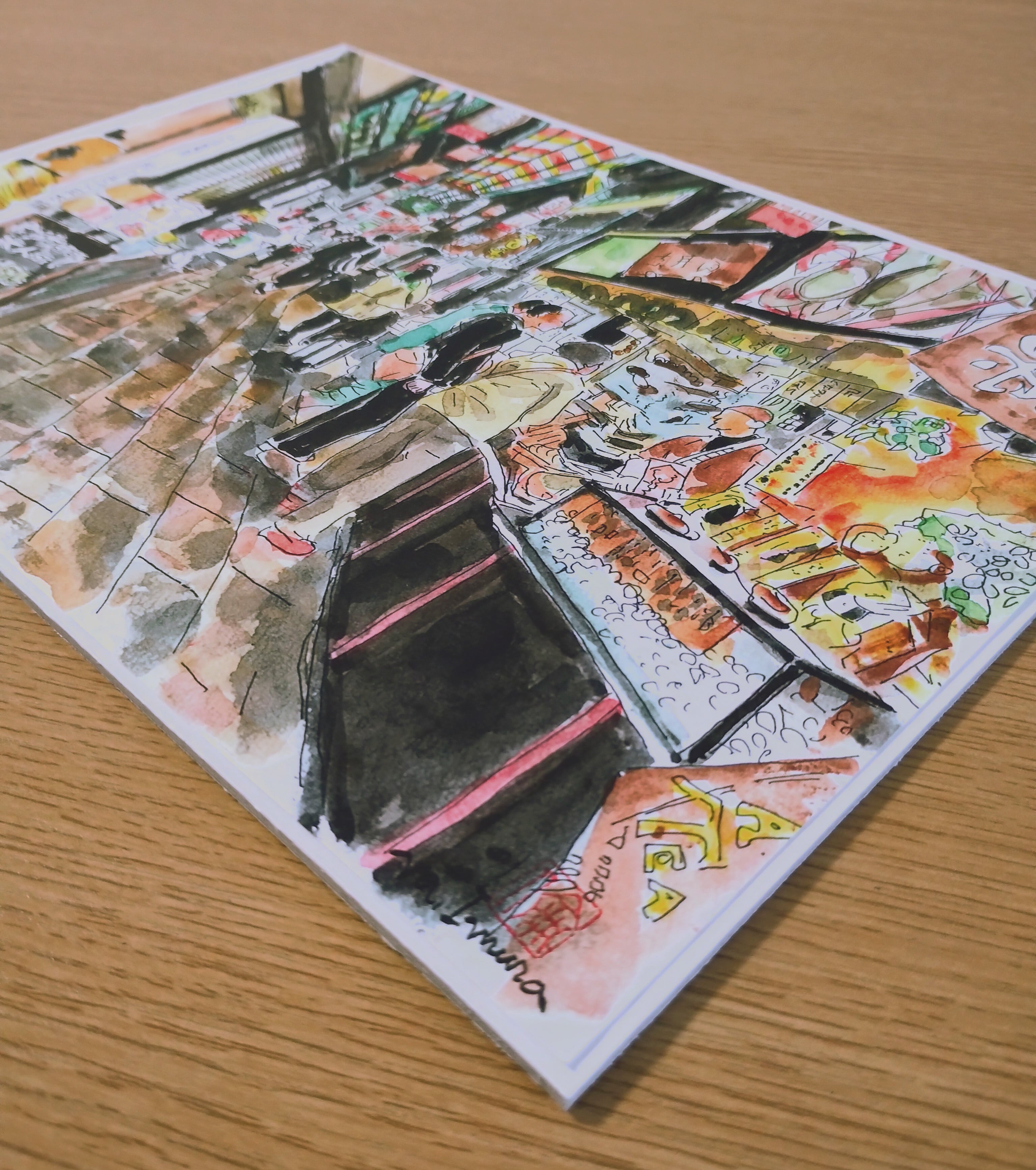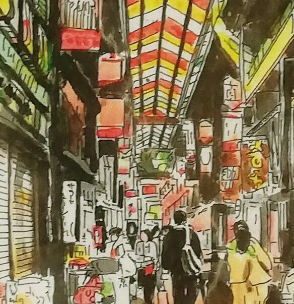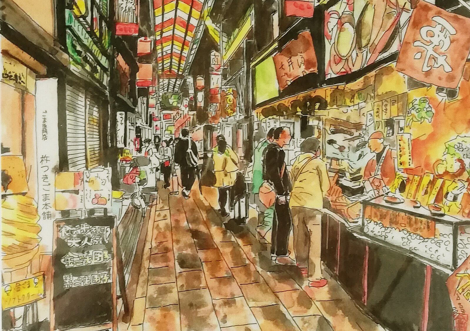 左右に立ち並ぶ様々なお店を暖かい色合いで描いています。