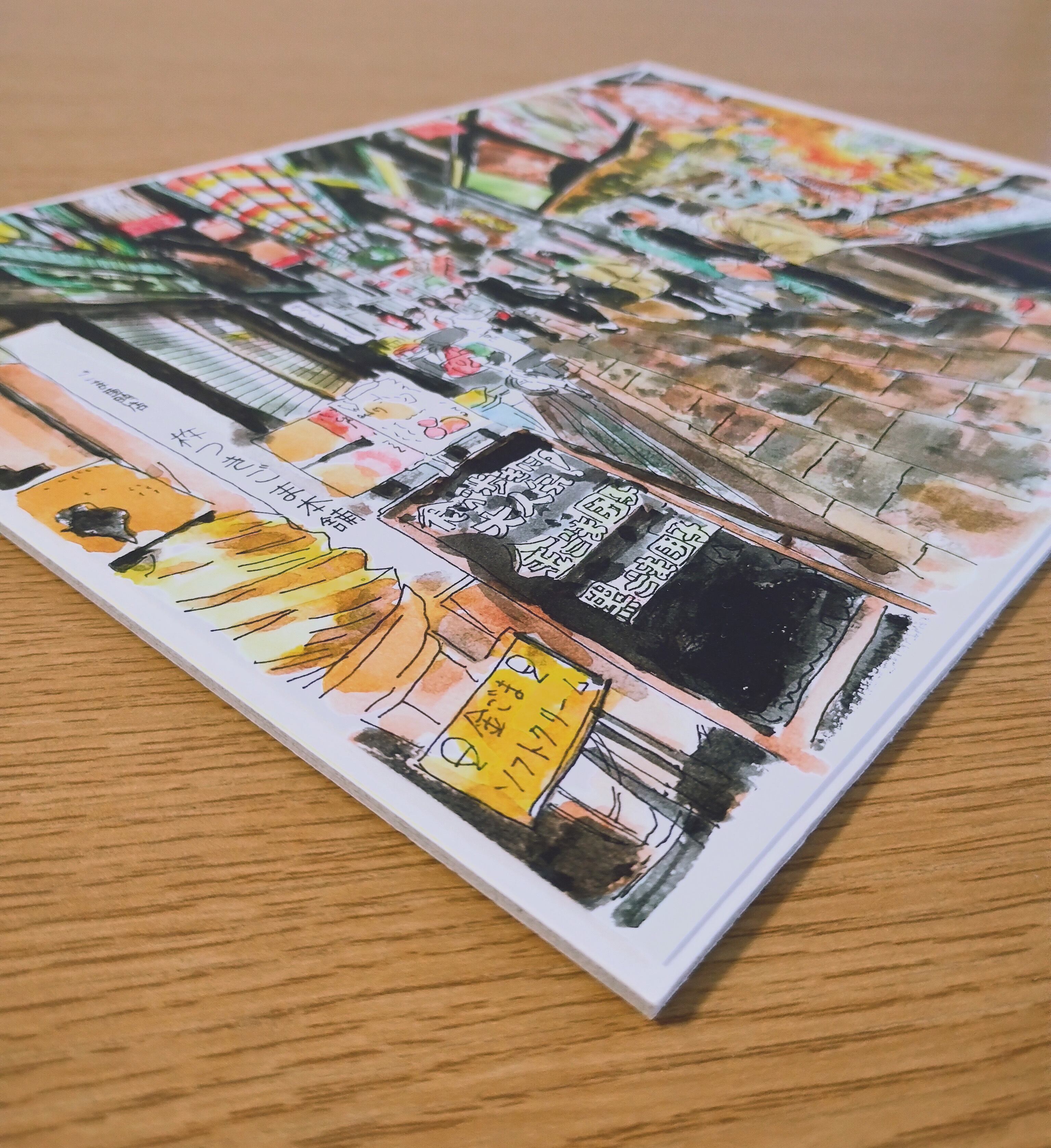 原画はペンで線描き後、透明水彩絵具で着色しています。
