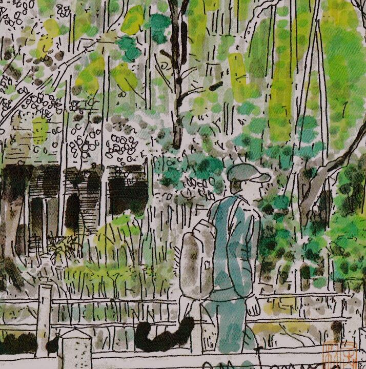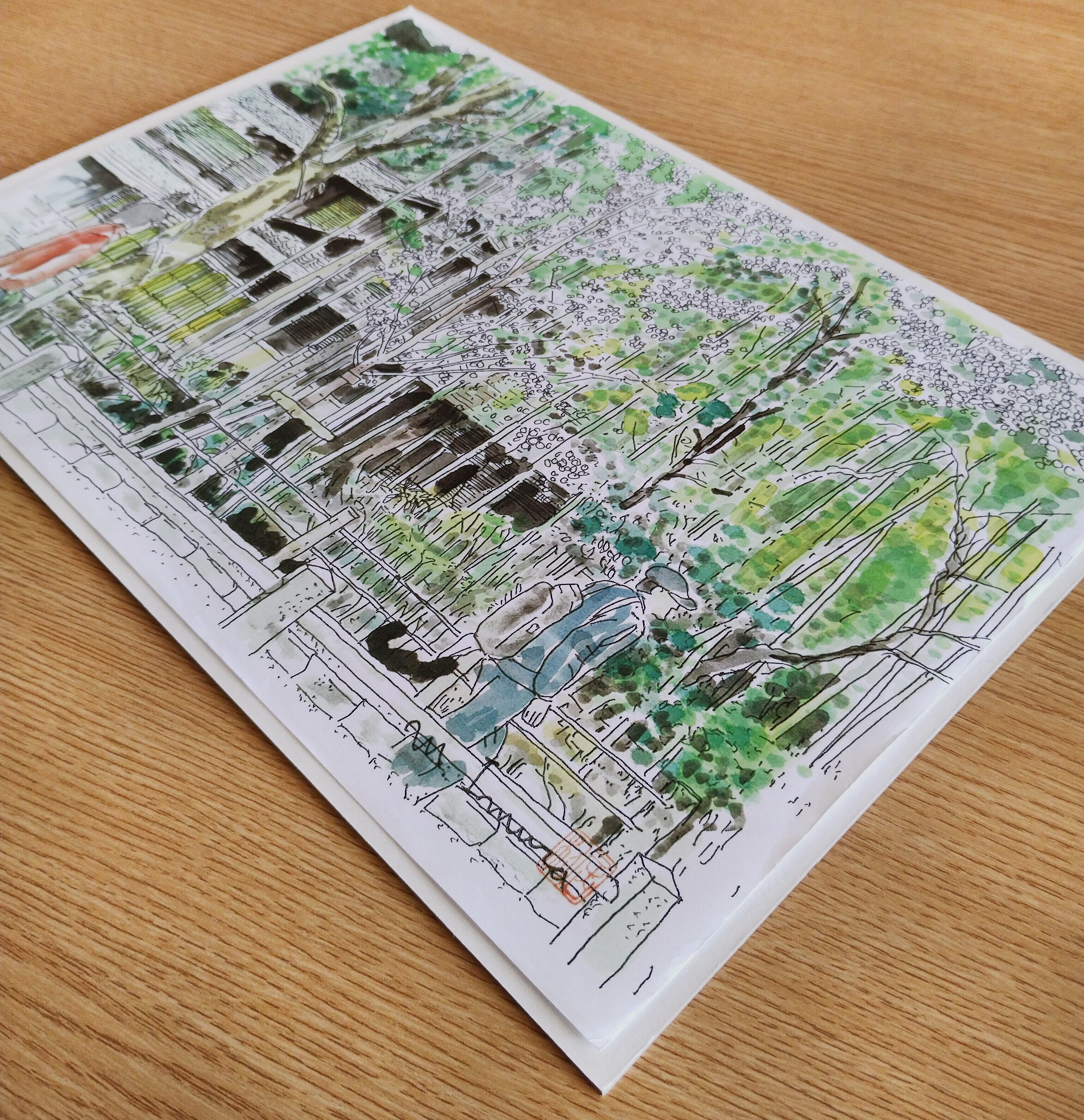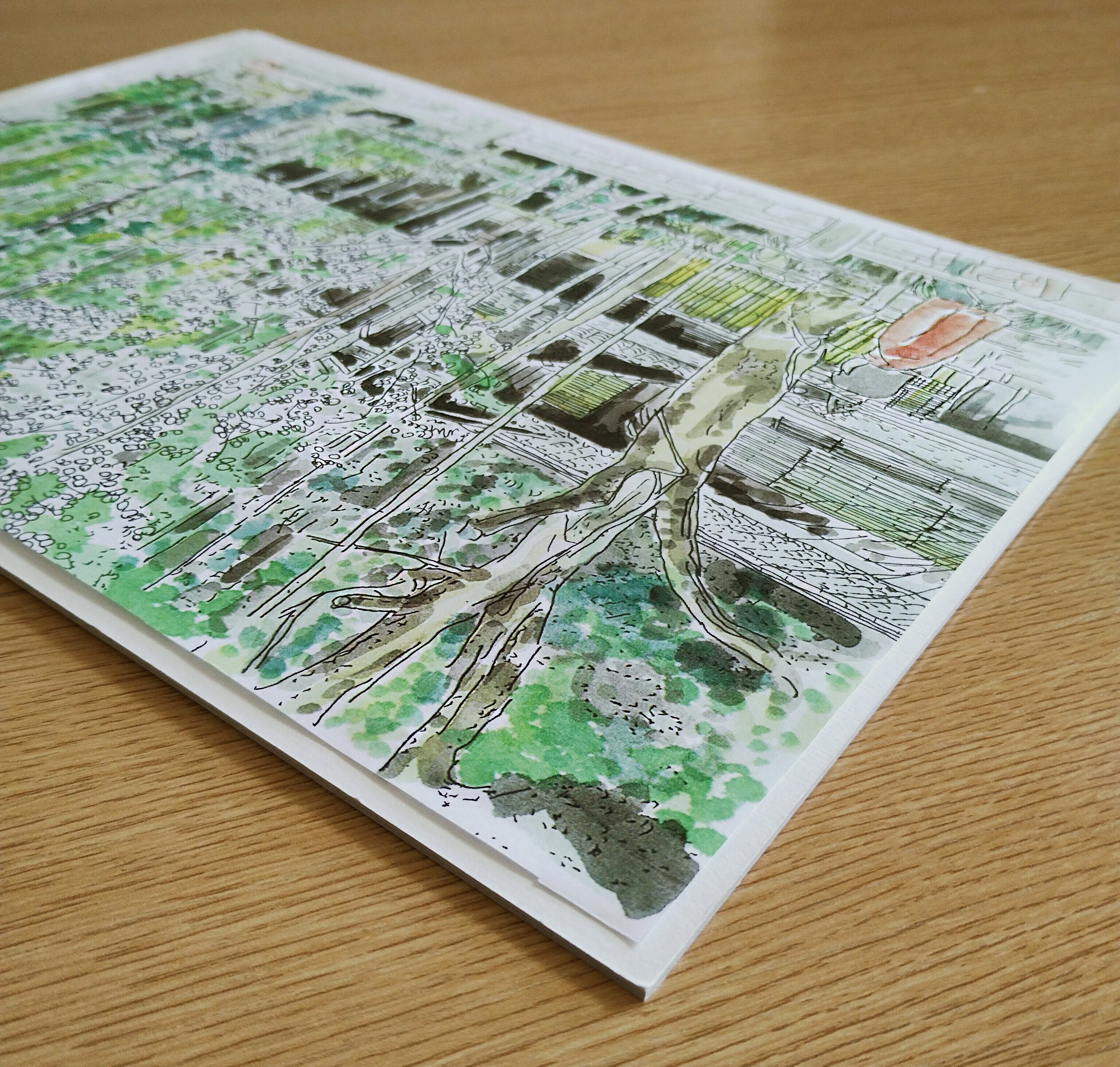 原画はペンで線描き後、透明水彩絵具で着色しています。